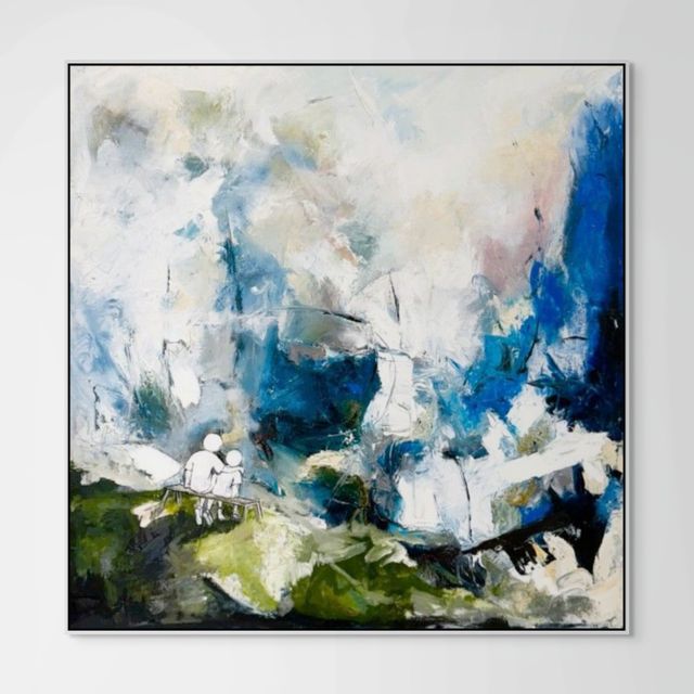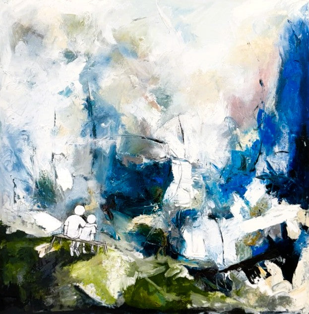 Abstract Impressionist oil painting depicting 2 boys sitting on a bench looking out into natures abyss, the older boy has his arm protectively slung across the shoulder of the younger boy, comforting and protecting him.