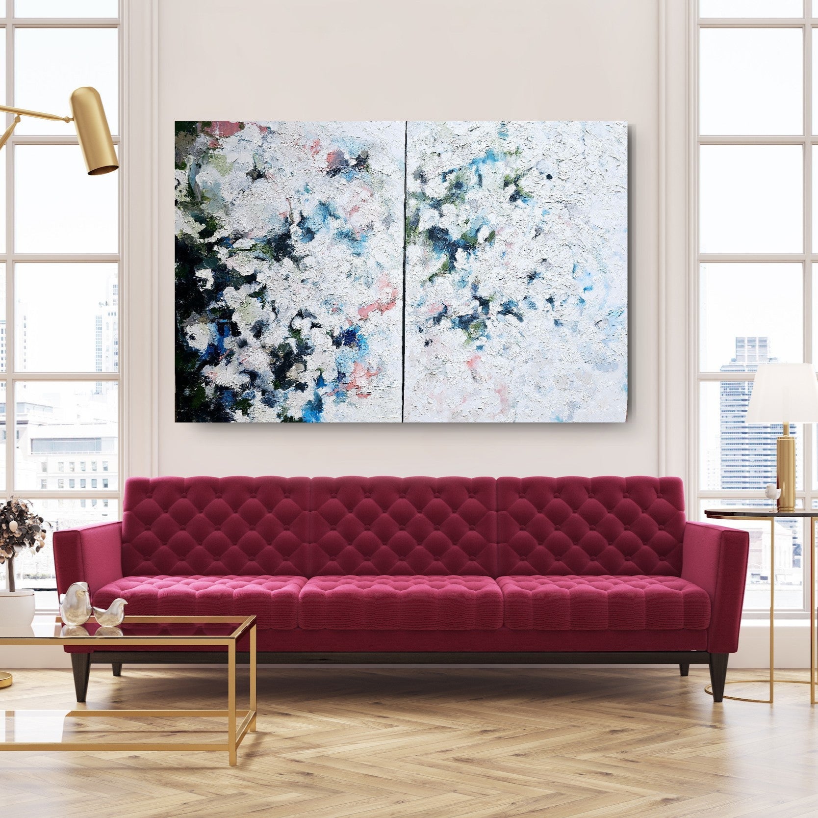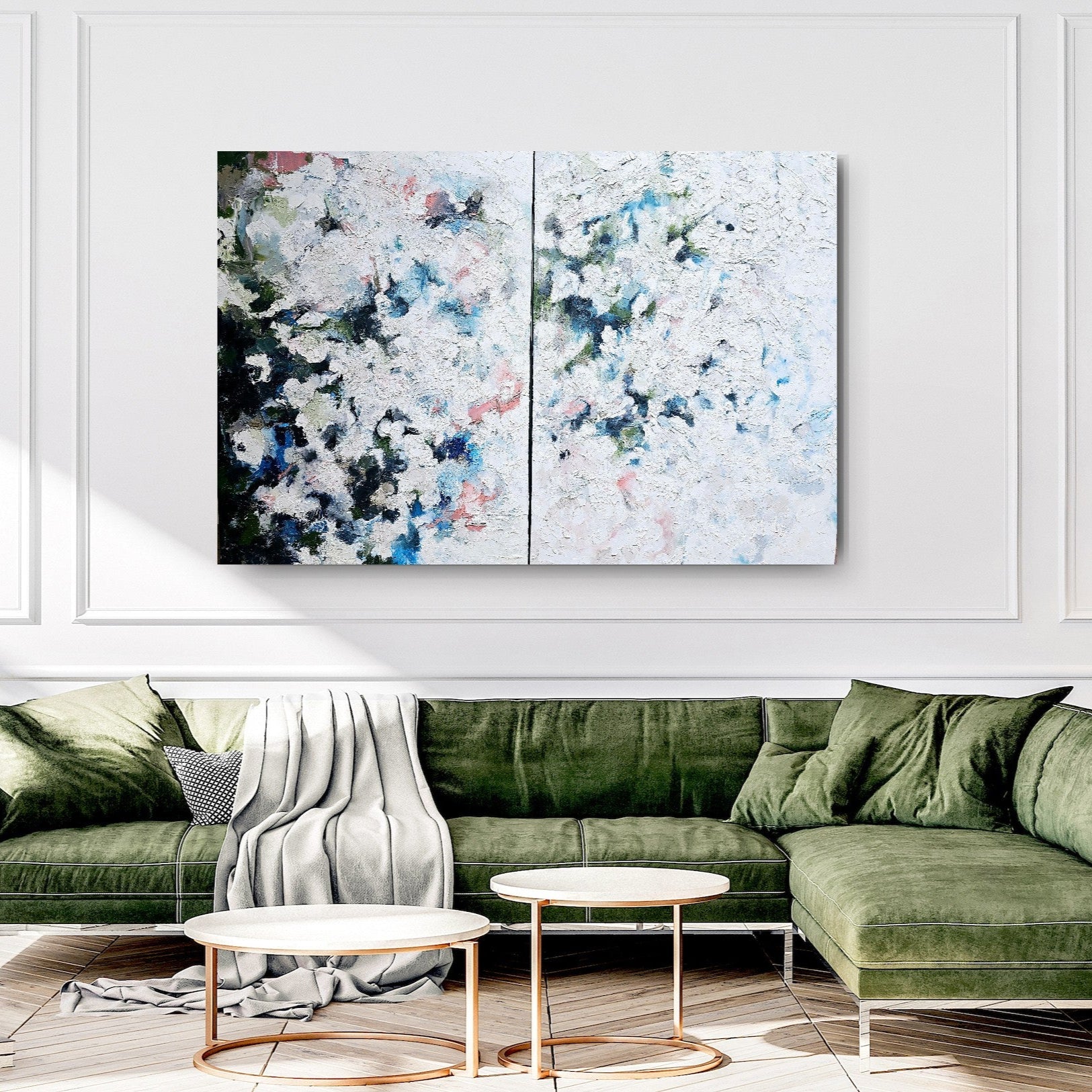 Blush Sky Bloom and Cotton Sky Bloom form a serene diptych inspired by the softness of spring blossoms, cotton clouds, and endless summer skies. With gentle, harmonious tones, these works evoke a sense of calm and peaceful presence, bringing an atmosphere of quiet beauty to any space.