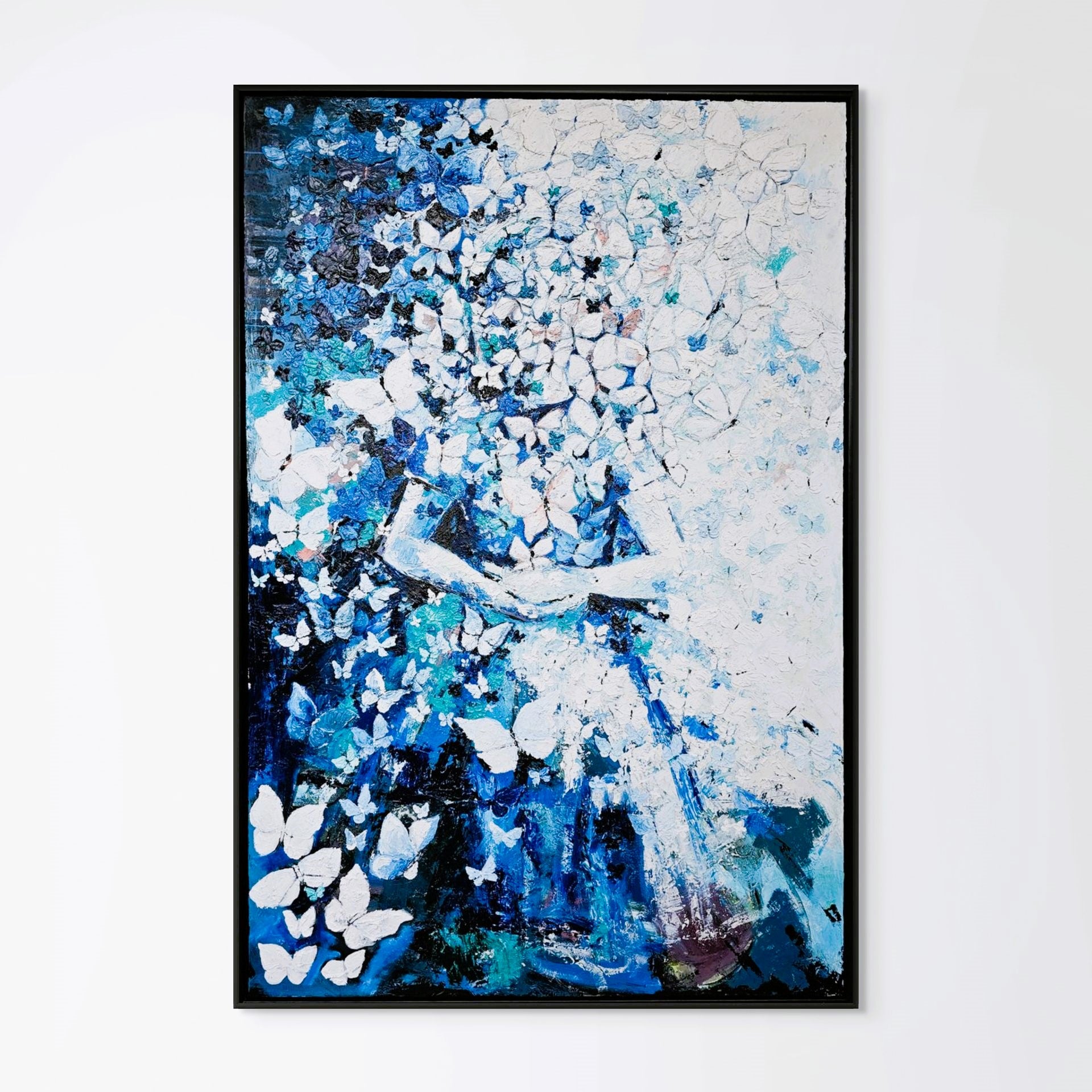 becoming. A young woman’s face, veiled in butterflies, captures the