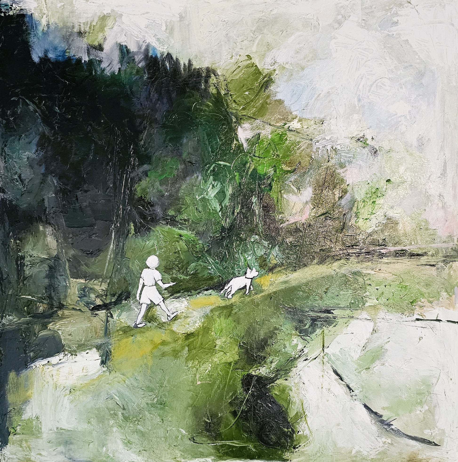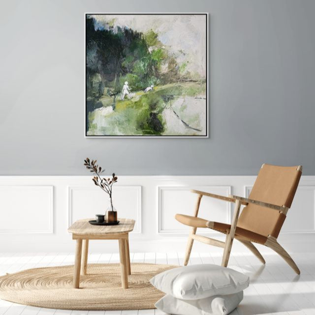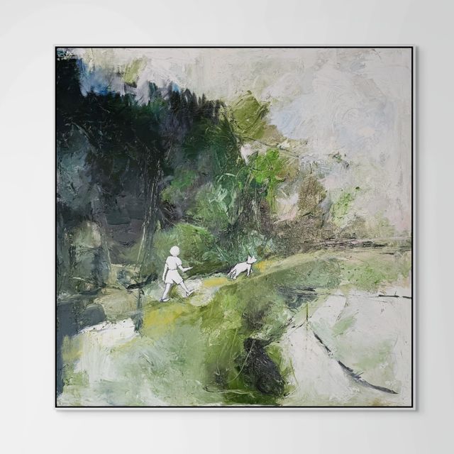 Abstract Impressionist work of a nature scene, with a figure and their dog along the green pathway. This work symbolises the connect between the 2, the painting is peaceful and serene and highly emotive.